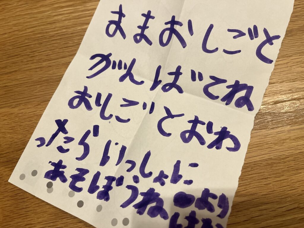 集中してパソコンに向かって仕事をしていると、お手紙を書いてもってきてくれました。